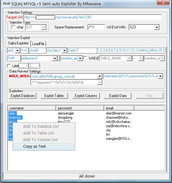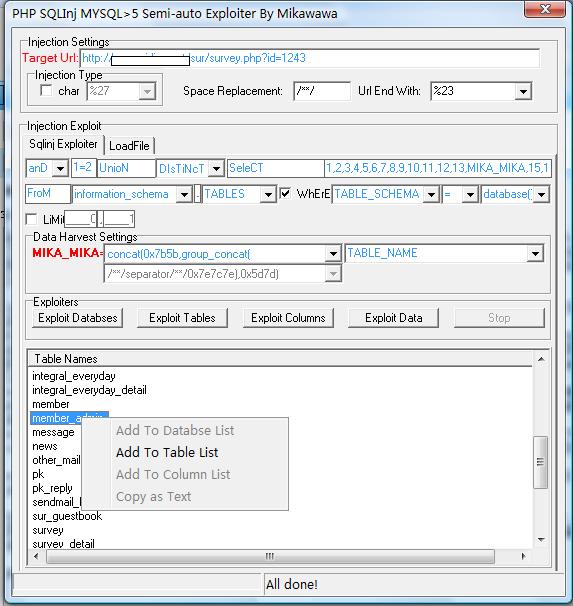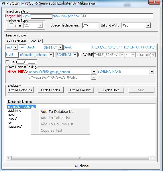 注入界面应该都能看得懂吧。中间就是查询语句的构造。其中最重要的就是"select"框后面的内容了,要将页面上能显出的对应数字替换成"MIKA_MIKA"。 Exploiters区域里的exploit databases是用来获取当前所有数据库的,直接点击一下就可以获取,不需要手动修改注入语句设置(你非要自己修改也没办法)。在下面的结果区域里,右键点击某条记录然后选择add to databse list可以将该条记录添加到f注入语句中的“from”输入框后面的列表框里以及“=”号后面的列表框里,这样就不用手工输入了(你非要手工输入没办法)。