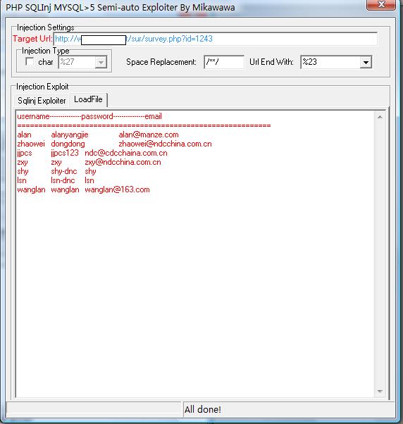 经常碰到这样的注入环境,但有的时候网上给的工具并不能完全应付所有的环境。比如有的会有过滤啊啥的,为了方便我特意写了这个工具。基本上可以应付所有的php+mysql5的注入环境,因为自己可以直接修改注入语句,所以只要手工能绕过的过滤,该工具都可以。而且我添加了最新使用group_concat获取数据的方式,可以大大降低注入时提交的语句量和获取数据的时间。先看看界面吧: