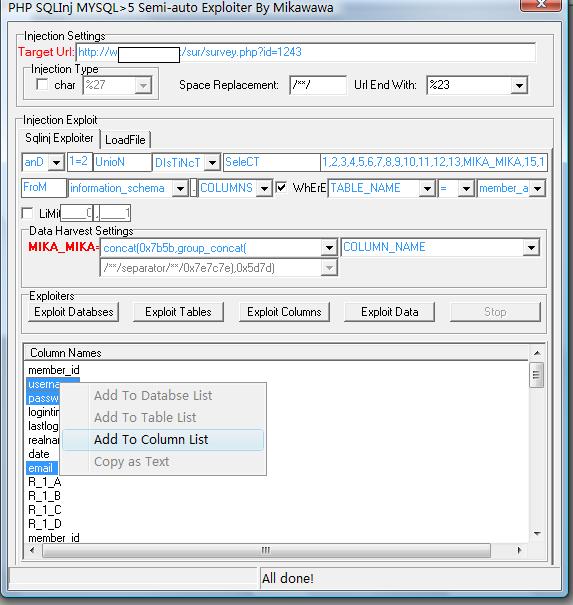 exploit columns是列举表的字段名字,修改"="后的表名字即可点击获取(其它程序会自动设置)。可以在下面的内容里右键选择add to column list添加到data harvest settings 里的“MIKA_MIKA=”后面的第二个框里。这里可以按住ctrl键一次添加多个字段。
